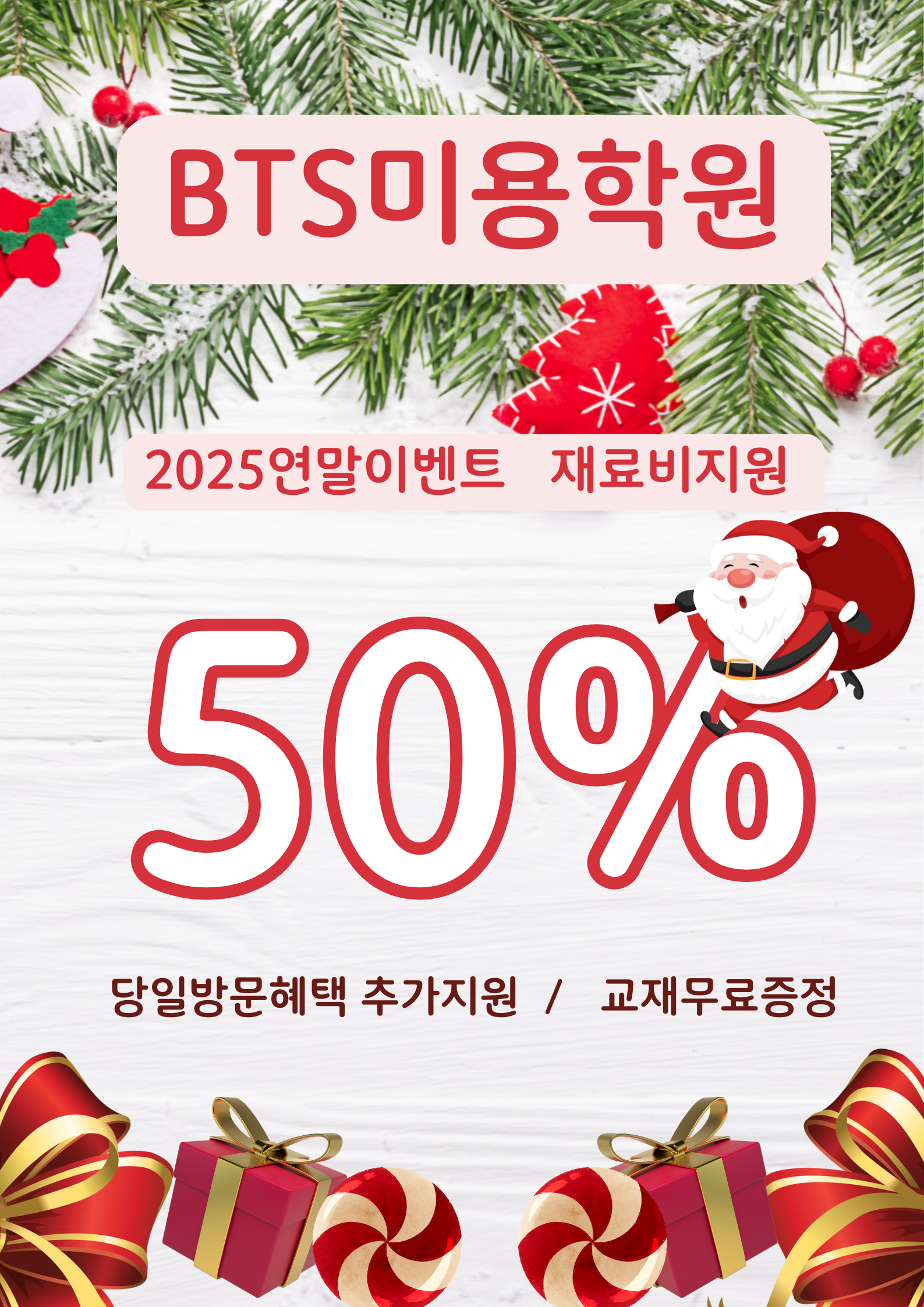 #BTS미용학원 #연말이벤트 #미용학원 #재료비지원 #50%할인 #당일방문혜택 #무료교재 #뷰티교육 #미용수강료 #헤어미용 #네일미용 #뷰티입문 #2025연말 #할인이벤트